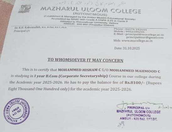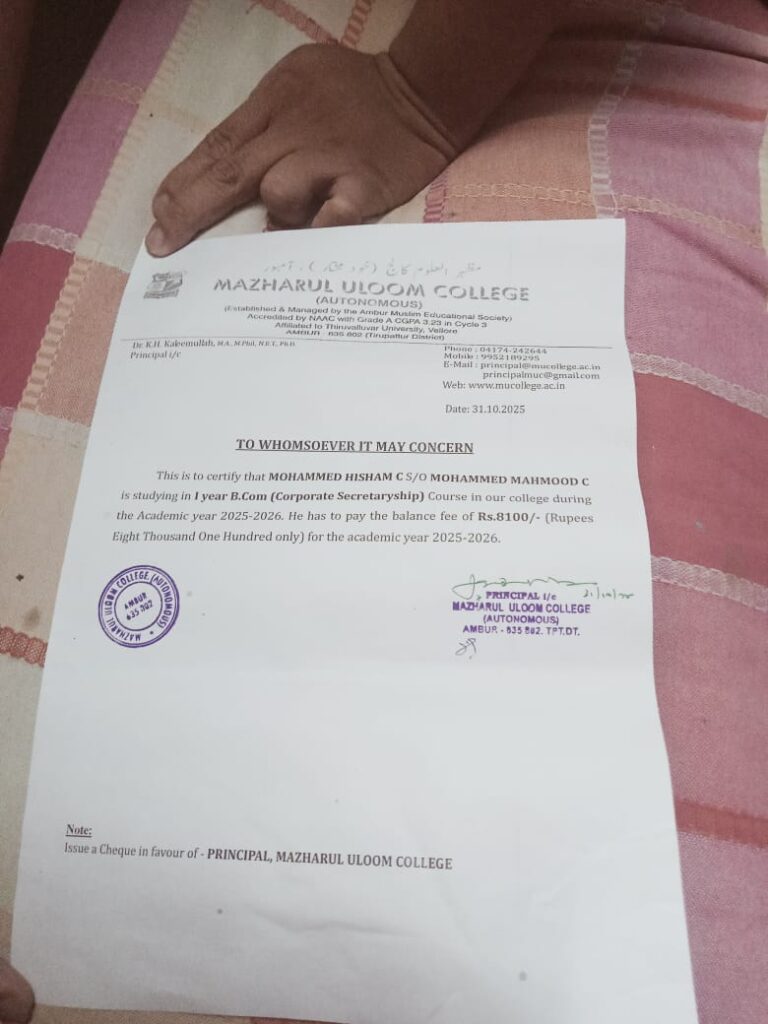 Hisham is a dedicated B.Com (CA) student who dreams of completing his education and building a better future for his family. Sadly, his father passed away due to illness, leaving behind his mother as the sole breadwinner. She works tirelessly as a daily wage laborer, but her income is barely enough to cover their basic needs.
