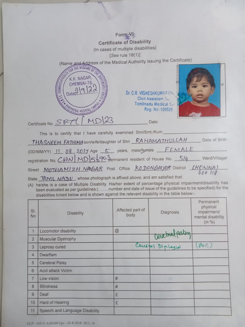 Adding to this hardship is his beloved daughter, Thasneem Fathima, who is differently-abled. Due to a condition affecting both her hands and several other parts of her body, she is unable to perform her daily activities independently. The government has officially certified her as a person with a disability, and she currently attends a special school that supports her needs.